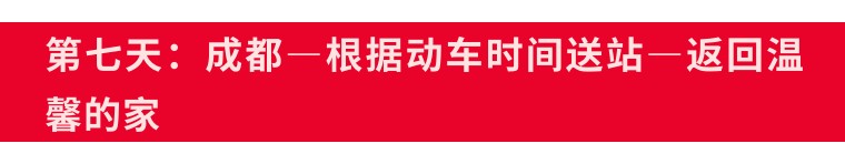 今日无行程安排,大家自由逛街,品尝特色美食,根据动车时间前往成都站,乘坐动车返回温馨的家,结束本次愉快旅行,期待下一次相聚;