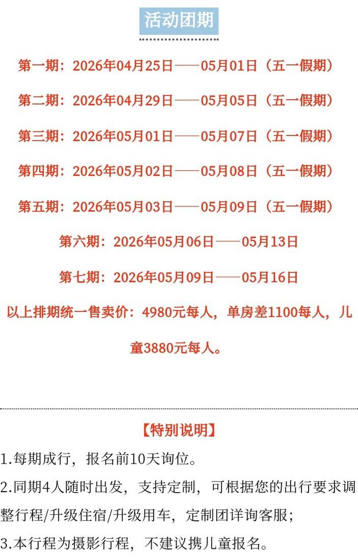 同期4人随时出发,支持定制,可根据您的出行要求调整行程/升级住宿/升级用车,定制团详询客服