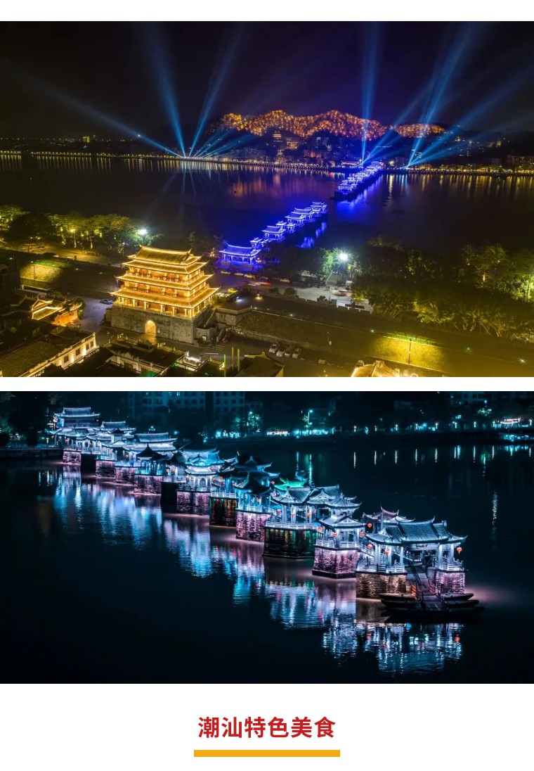 2. 潮州古城:畅玩广济桥、广济楼、牌坊街、开元寺等精华景点。来一顿地道牛肉火锅,载阳茶馆吃茶听潮剧,赏广济桥灯光秀