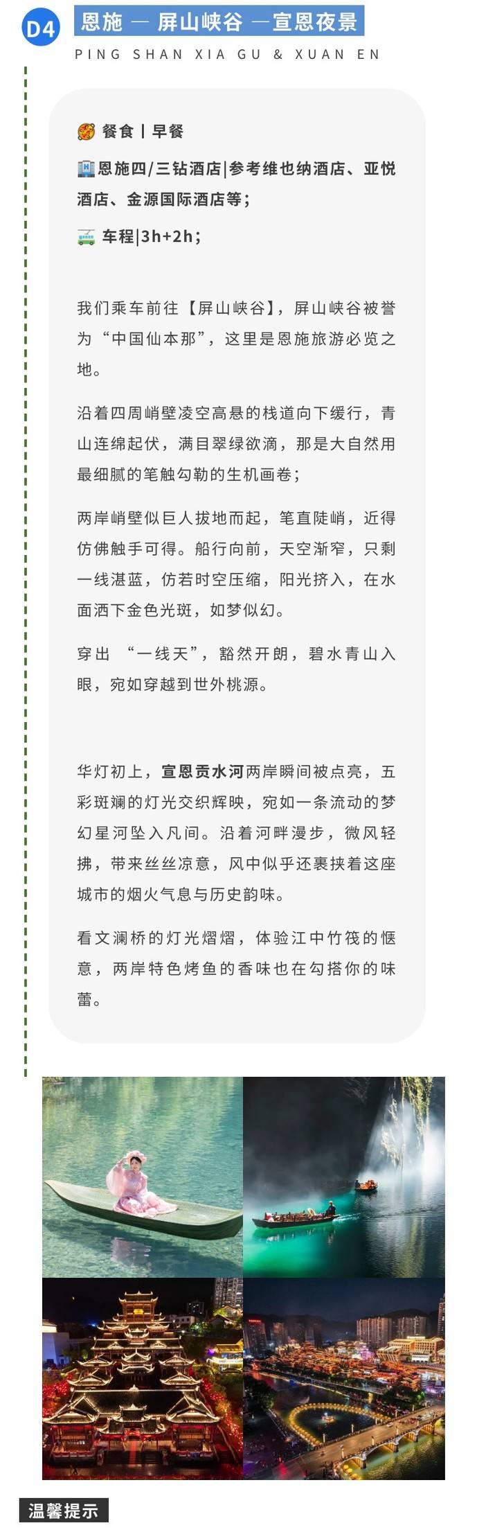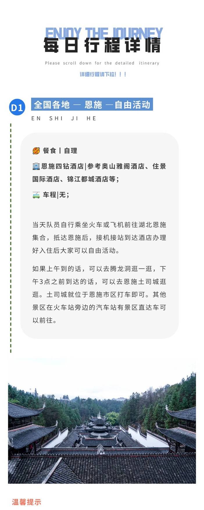 4.恩施昼夜温差比较大,建议晚上备好一件保暖衣物;请提前查好天气并询问旅行管家;