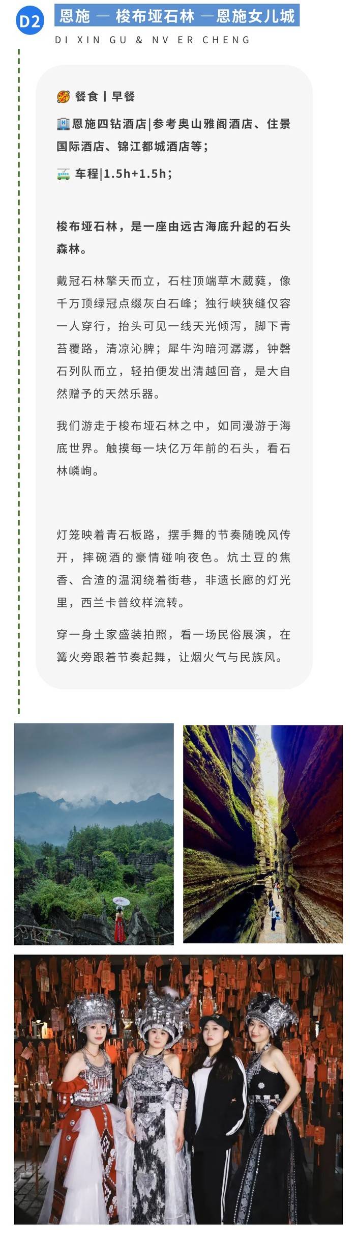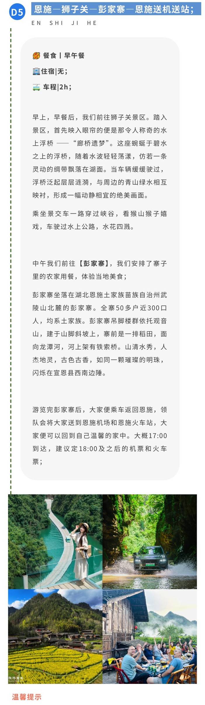 2.由于此产品游览区域属于恩施土家族苗自治州,经济发展缓慢,物资匮乏,旅游资源条件有限,无法与一二线城市旅游资源比较,如遇相关问题敬请谅解