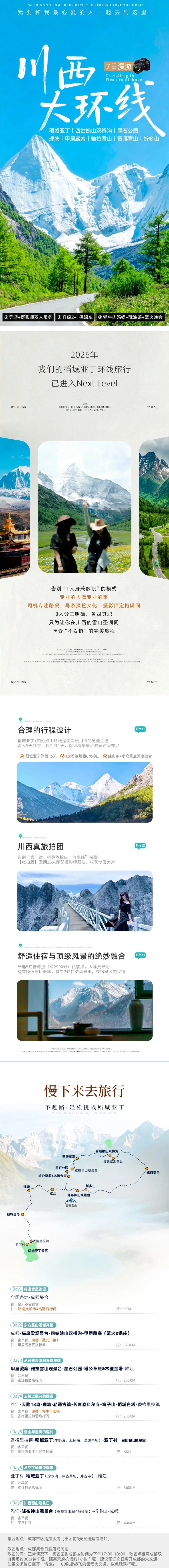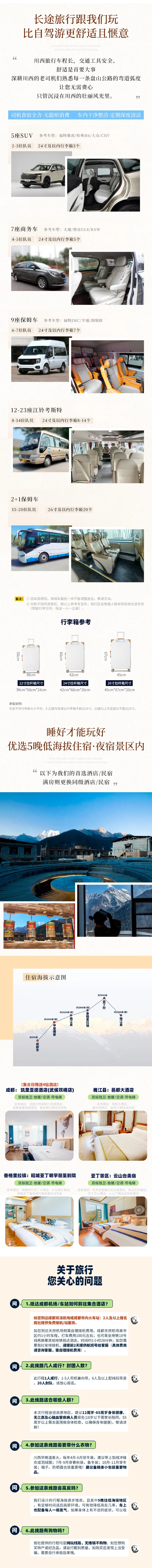 (3)以上行程时间安排可能会因天气、路况等原因做相应调整,正常情况下完团回到成都的时间为晚上17:00-18:00,散团点距离成都双流机场约30分钟车程,距离天府机场约1小时车程,建议预订次日离开成都的大交通,如果必须当日离开,请定21:00以后起飞的回程大交通,以免耽误行程;